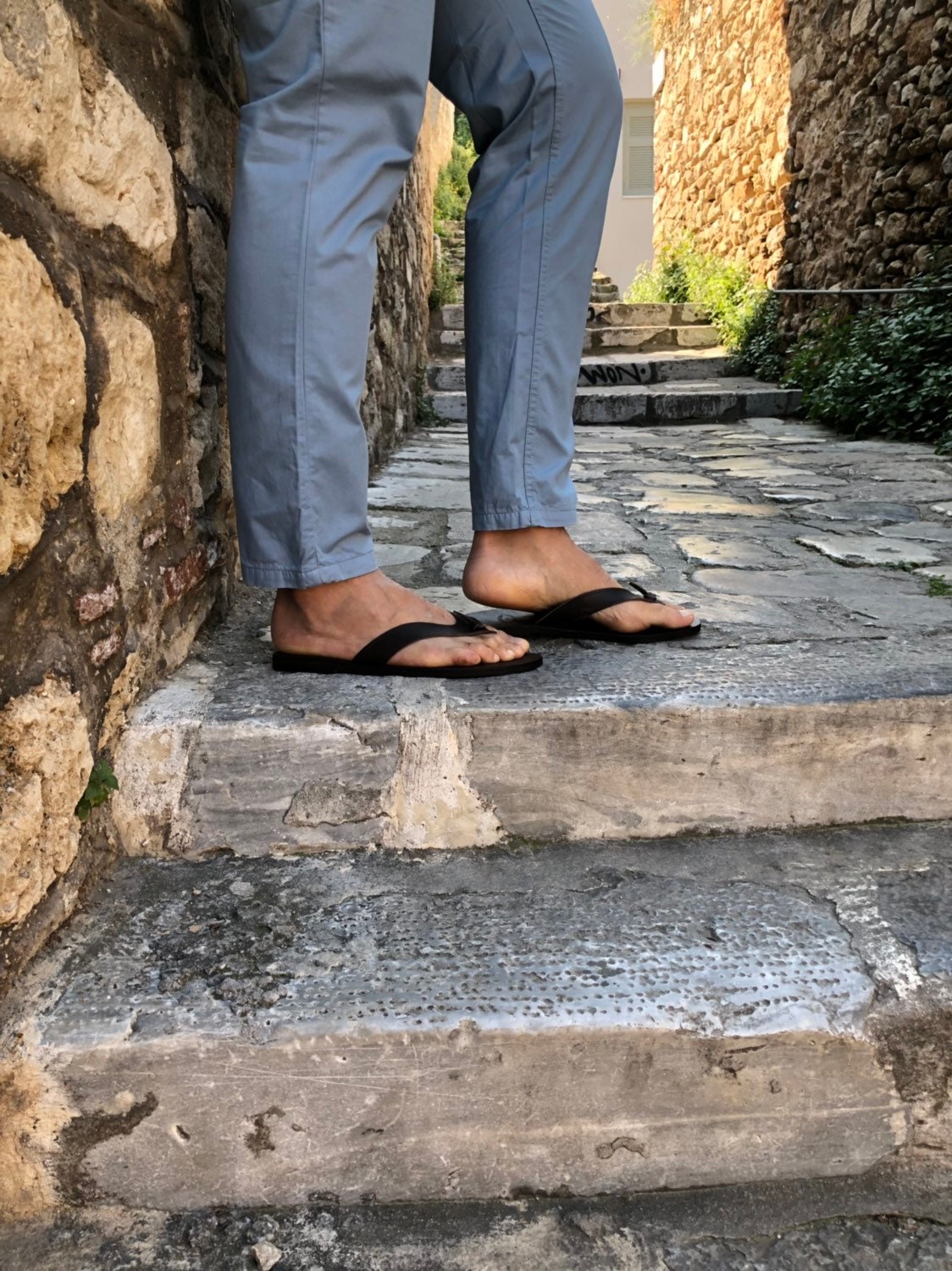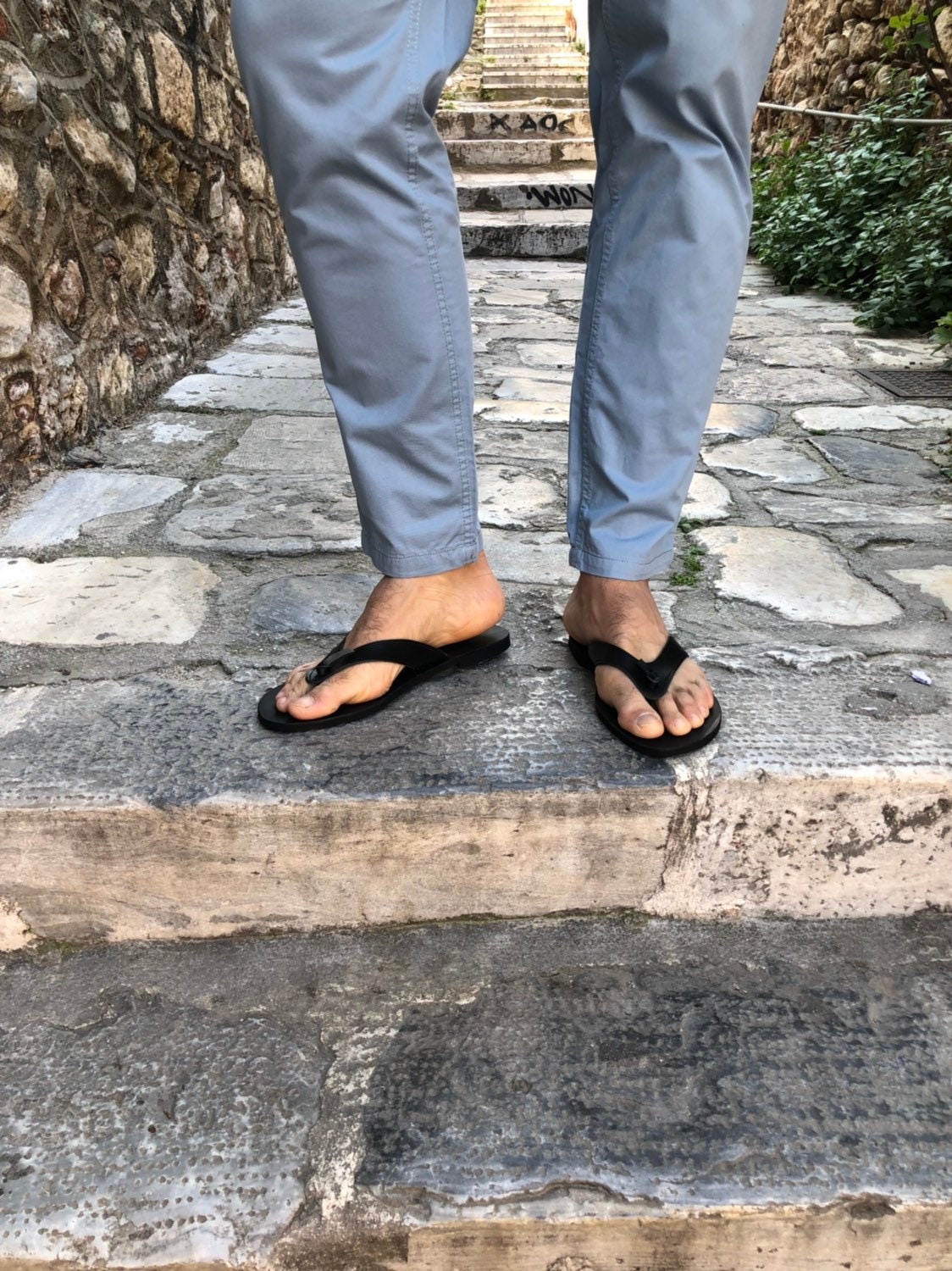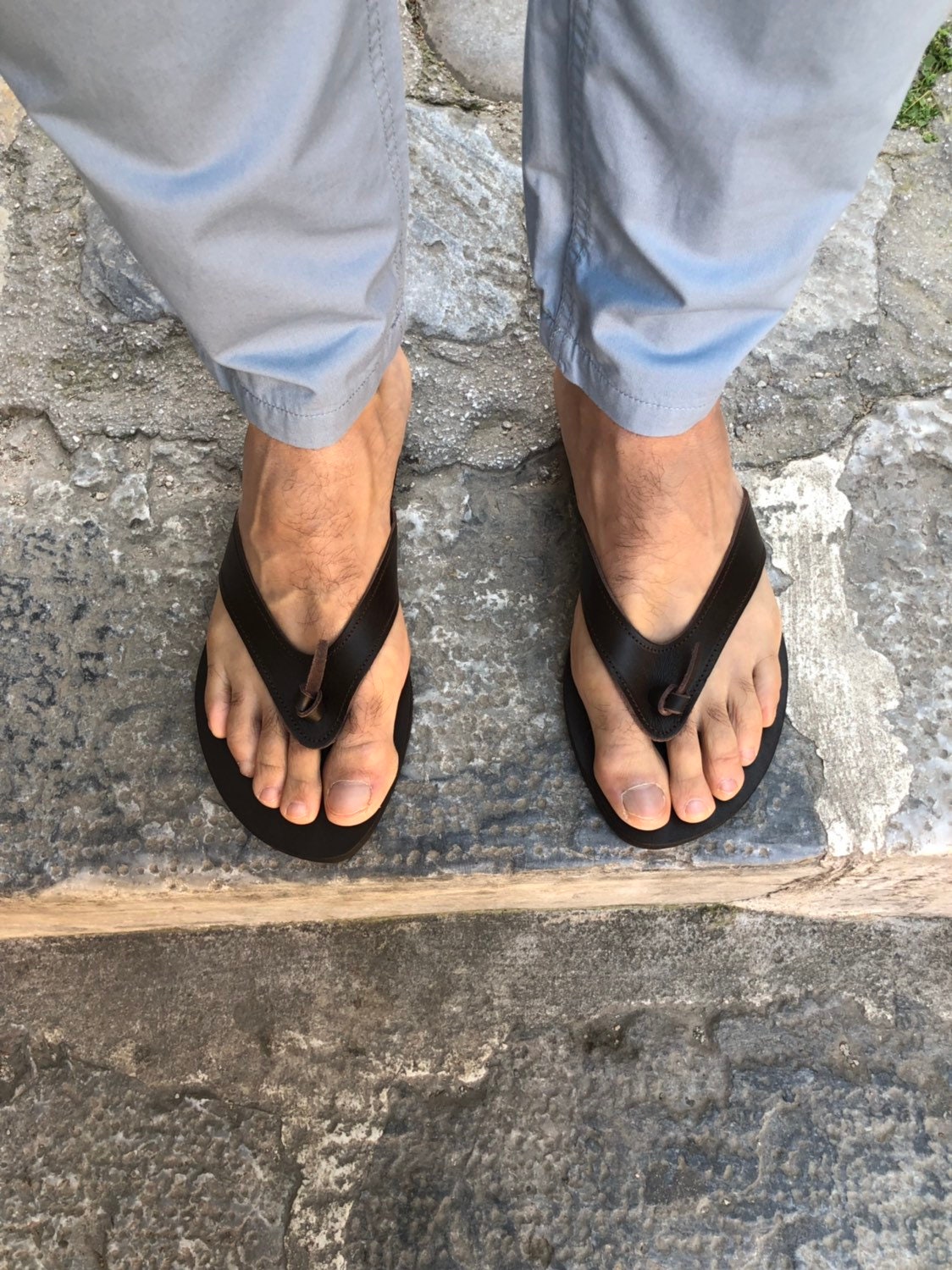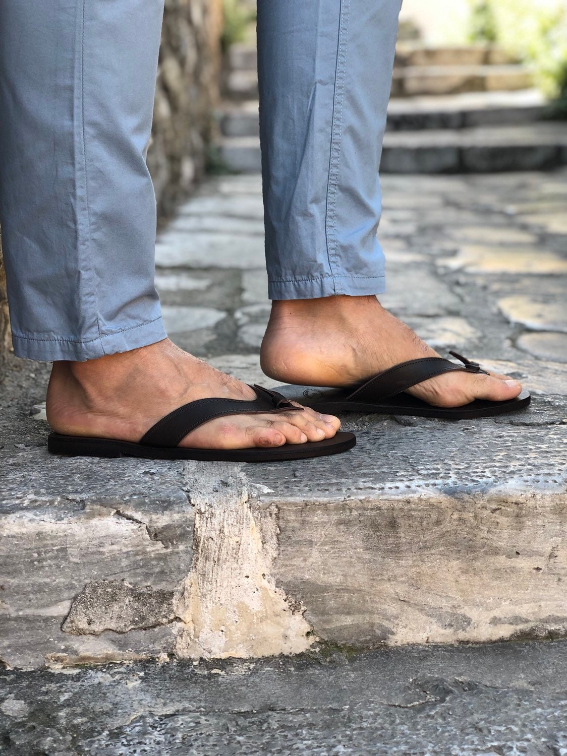 A handmade pair of flip flop sandals for men with a knot in deep brown color, that is made from genuine leather in Greece.